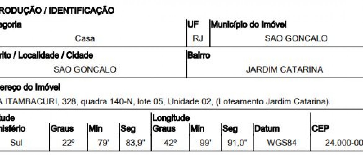 RUA ITAMBACURI,N. 328 LT 05 QD 140 N CS 02, JARDIM CATARINA - CEP: 24715-591, SAO GONCALO - RIO DE JANEIRO nº 02